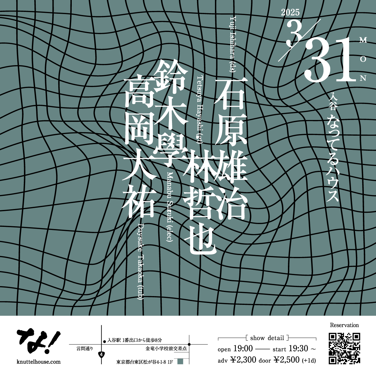 2025.3.31 鈴木學 高岡大祐 林哲也 石原雄治 DESIGN WORK LIVE SCHEDULE FLYER 3/31月 入谷 なってるハウスopen 19:00 start 19:30 ¥2,500(予約¥2,300)+オーダー鈴木學 electronics高岡大祐 tub林哲也 g石原雄治 ds 鈴木さん自作のタイマー仕掛けの演奏です。前回参加時は演奏していて屈指の面白さでした。是非どうぞ。 投稿ナビゲーション 2025.3.30 quizkid2025.4.6 SAILORMEN “清明の大航海” 其の壱