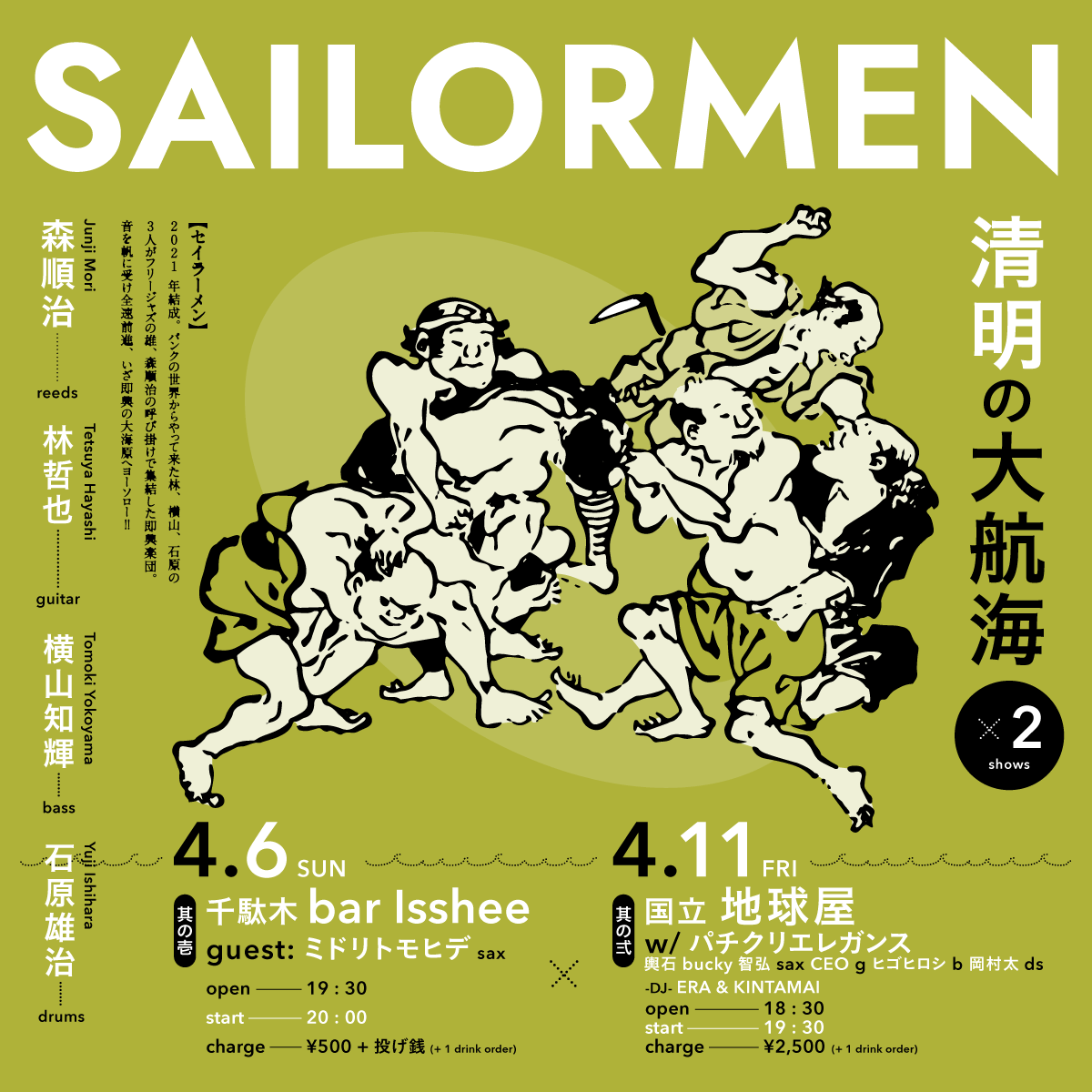 2025.4.11 SAILORMEN “清明の大航海” 其の弍 DESIGN WORK LIVE SCHEDULE FLYER ⚡️⚡️SAILORMEN “清明の大航海” 2 shows⚡️⚡️其の弍)4/11金 国立 地球屋・SAILORMEN/ 森順治 reeds 林哲也 g 横山知輝 b 石原雄治 ds・パチクリエレガンス/ 輿石bucky智弘 sax CEO g ヒゴヒロシ b 岡村太 ds・DJ- ERA&KINTAMAIopen 18:30 start 19:30charge ¥2,500 +ドリンクオーダー 投稿ナビゲーション 2025.4.7 200mph “GIRLS AGAINST BOYS / SOULSIDE Japan Tour 2025”2025.4.13 quizkid