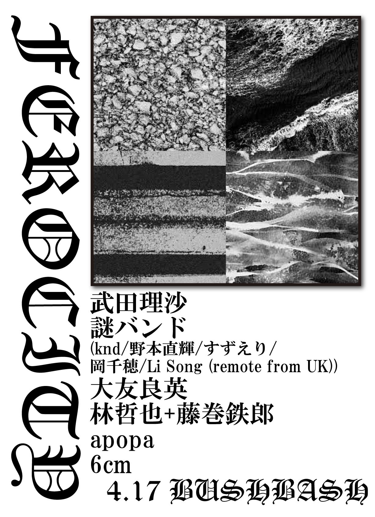 2025.4.17 “FEROCITY” LIVE SCHEDULE 4/17木 小岩 BUSHBASHapöpa & BUSHBASH presents“FEROCITY”2025/4/17(thu) at BUSHBASH -LIVE-武田理沙謎バンド(knd、野本直輝、すずえり、岡千穂、Li Song (remote from UK))大友良英林哲也+藤巻鉄郎apöpa -DJ-6cm OPEN 19:00 START 19:30 DOOR 2000yen(+1d order) 投稿ナビゲーション 2025.4.13 quizkid2025.4.18 渡邉英一 林哲也