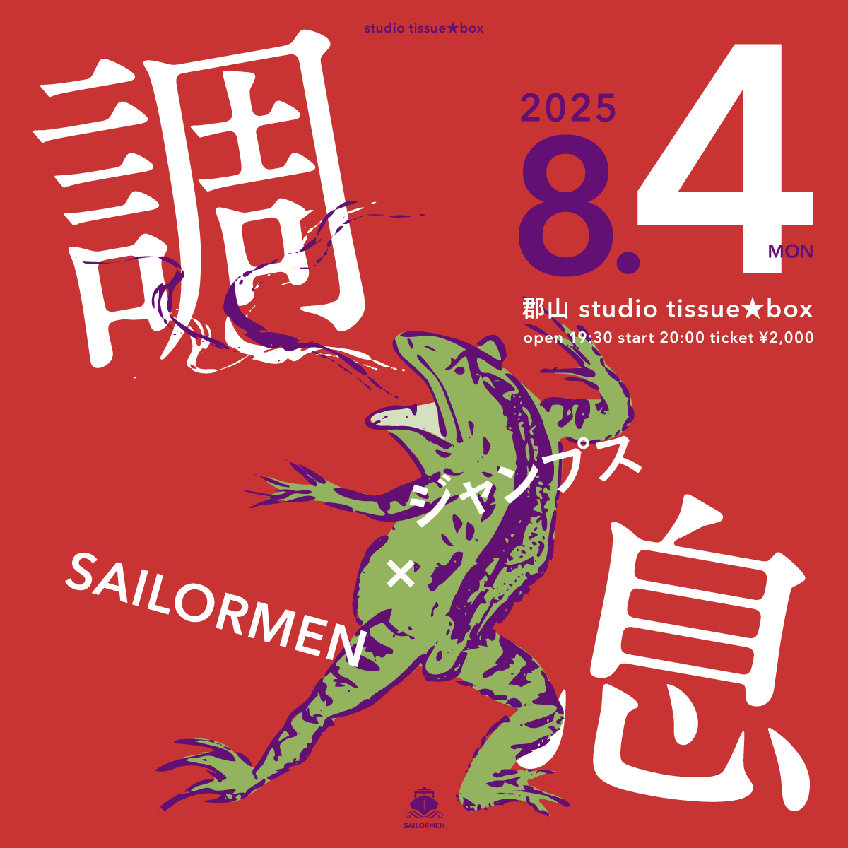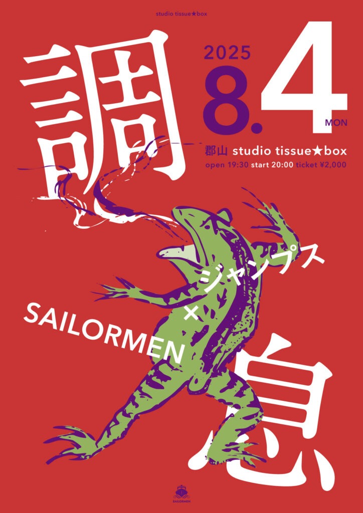 2025.8.4 ジャンプス × SAILORMEN “調息” DESIGN WORK LIVE SCHEDULE FLYER 8/4月 郡山 studio tissue★box“調息”open 19:30 start 20:00 ticket 2,000円 ジャンプス/鈴木良典 g, vo荒川淳 vla, tp, vo SAILORMEN/森順治 reed林哲也 g横山知輝 b石原雄治 ds ミニ遠征、郡山tissue★boxにてワンダーデュオ、ジャンプスとの2マンショー! 投稿ナビゲーション 2025.7.22 “SAILORMEN-1 大暑の大航海”2025.8.9 “BRAHMAN 30th Anniversary BRAHMAN×颱風一家”