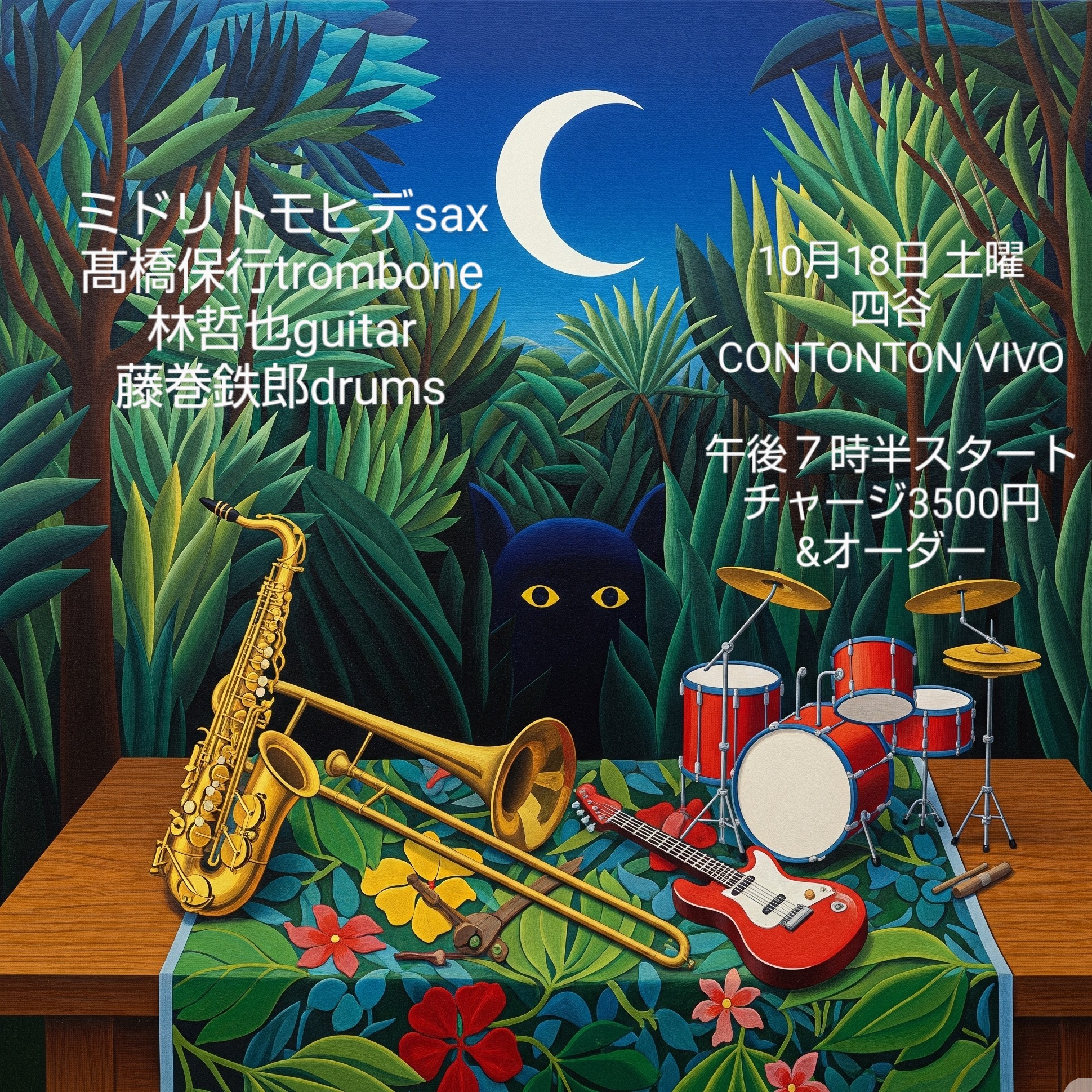 2025.10.18 ミドリトモヒデ 高橋保行 林哲也 藤巻鉄郎 LIVE SCHEDULE 10/18土 四ッ谷 CON TON TON VIVO ミドリトモヒデ sax高橋保行 trombone林哲也 guitar藤巻鉄郎 drums チャージ 3,500円+d ミドリさんの曲やインプロにてお届けします是非どうぞ! 投稿ナビゲーション 2025.10.16 SAILORMEN+Warit Techakanont Tonnam2025.10.24 いぐち式カーニバルカオス 『月見ル君想フ21th anniversary!! 〜月ノ下盆狂踊り』